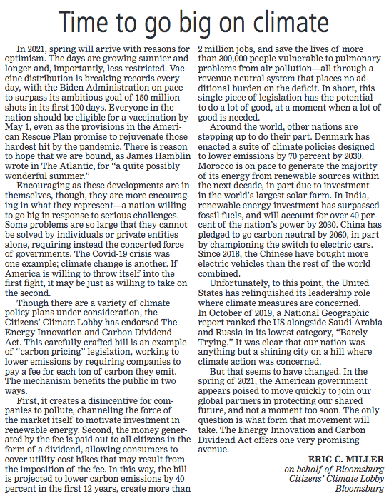 Our third letter of 2021 appeared in the Bloomsburg Press-Enterprise on Friday, March 19. To learn more about the mechanism of “carbon fee and dividend,” visit the Citizen’s Climate Lobby explainer. For more information on the Energy Innovation and Carbon Dividend Act, check out energyinnovationact.org.