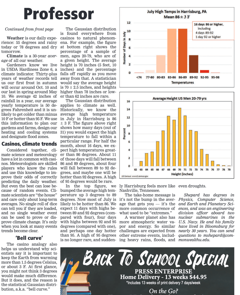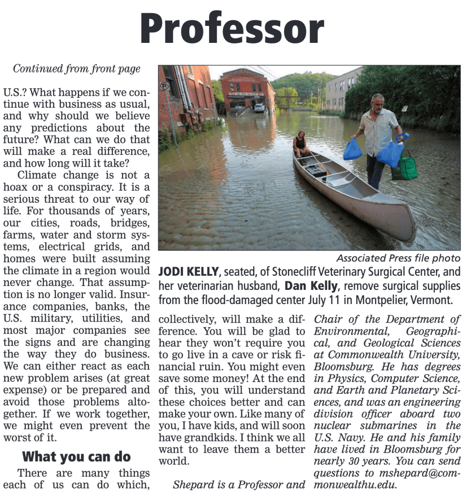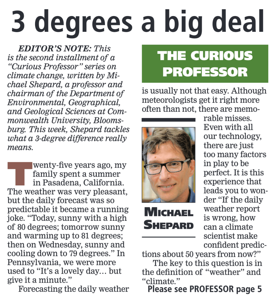 This fall, the Bloomsburg Press-Enterprise is running a series of guest columns by Bloomsburg University EGGS Chair Dr. Michael Shepard, on the subject of climate change. We’re excited about the series, and will archive the entries here. The first edition appeared in the PE on Wednesday, August 30. Subscribe to the paper here.