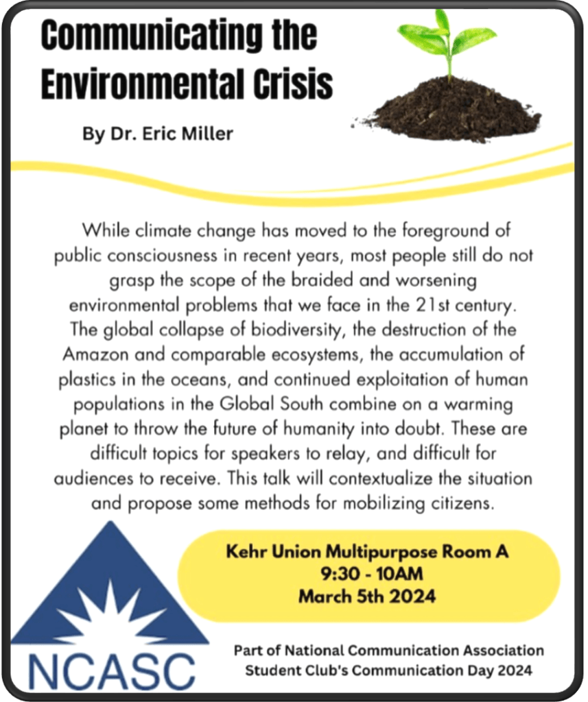 On Wednesday morning, March 12, chapter leader Eric C. Miller will be presenting on climate communication and the “Great Acceleration,” suggesting a helpful framework for thinking about climate impacts in the 21st century. This talk is part of larger slate of presentations scheduled for the university’s annual “Communication Day.”